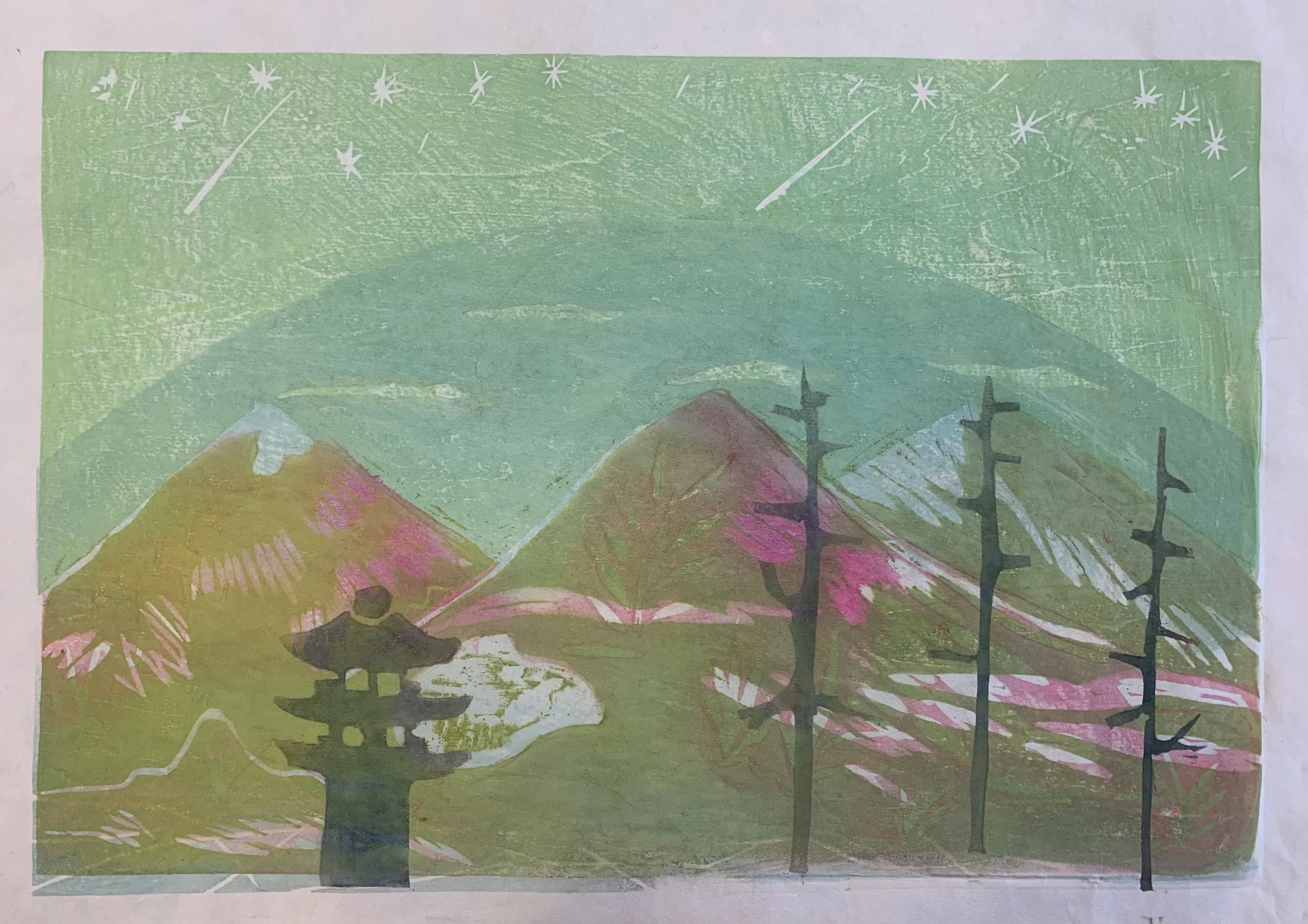 “Green Mountains”, Mokuhanga woodblock print, Washi paper , 45cm x 30cm, 2022